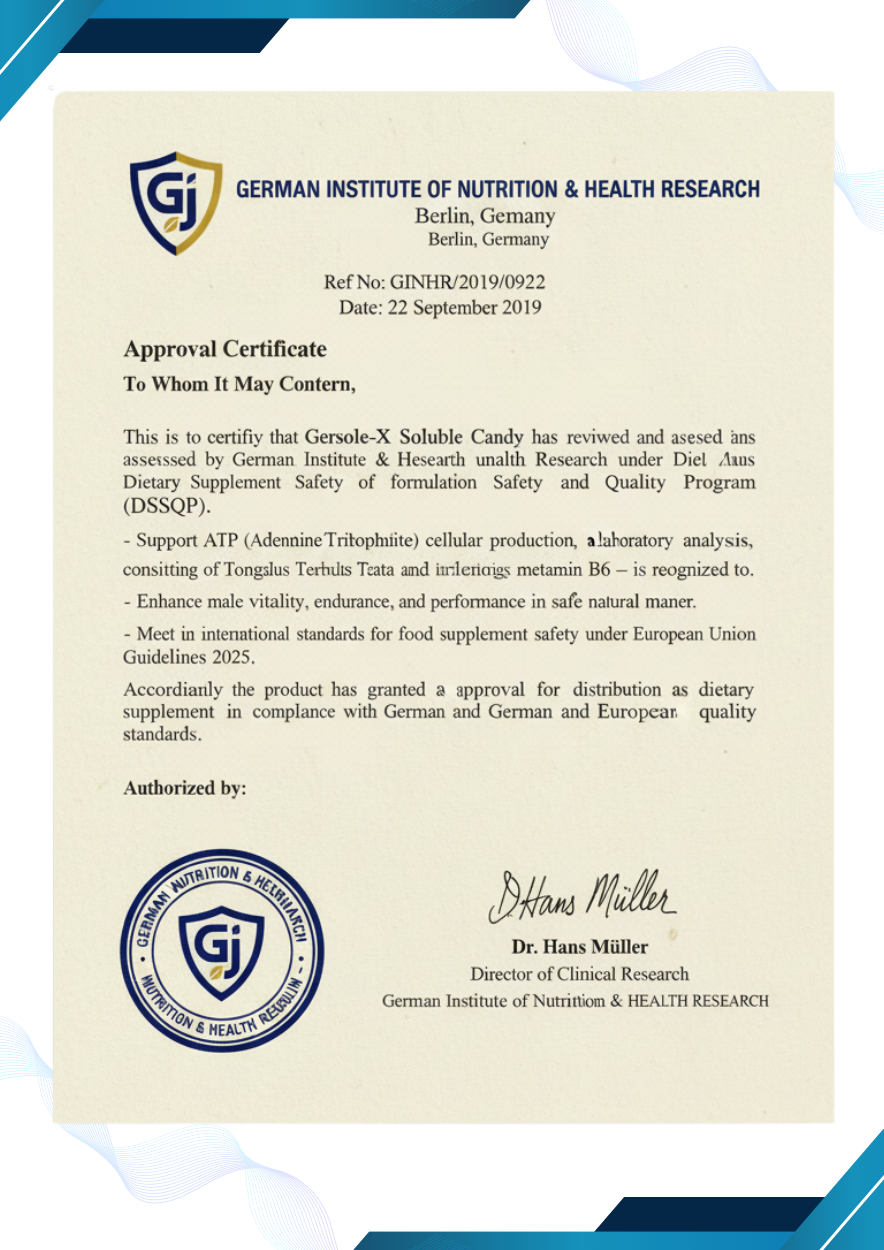 Gersole-X ialah candy BUIH teknologi Jerman yang dirumus khas dengan herba lelaki & vitamin moden untuk hidupkan semula ATP (tenaga sel lelaki). ATP inilah kunci kekuatan, ketahanan, dan prestasi jantan. Bila ATP lemah, lelaki jadi cepat letih, pancut awal, zakar tak keras lama, dan keyakinan runtuh. Gersole-X ibarat launch pack tenaga lelaki yang bagi enjin kau hidup semula.