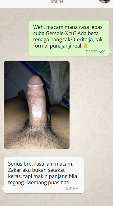 "Weh, serius malam tu lain. Gersole-X dah bagi aku keras lama, lepas tu dengan Perfume Unreal bini aku makin terbakar. Dia kata bau tu buat dia rasa nak peluk aku tak lepas. Memang combo win."
