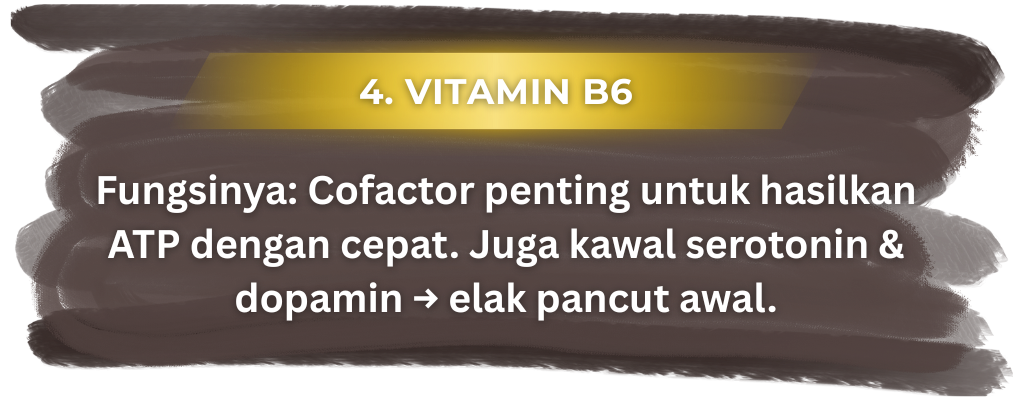 “Vitamin B6 ibarat kunci enjin — tanpa dia, ATP slow. Dengan dia, kau kawal pancut & tahan lama.”
