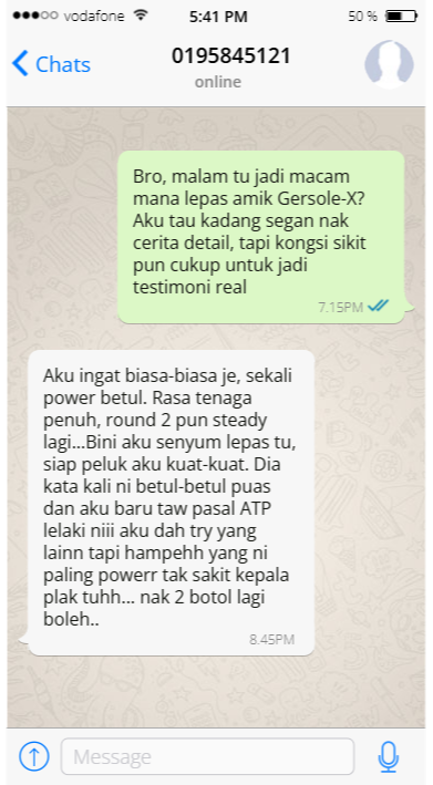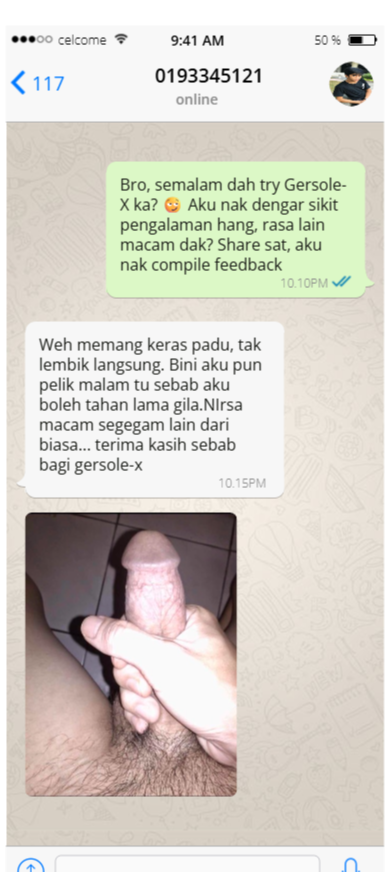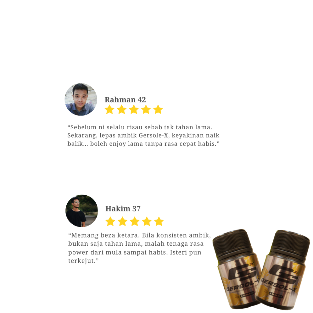 "Aku dah try Gersole-X, memang tenaga lain macam. Sekali spray Perfume Unreal, bini aku terus makin rapat, ghairah dia lain macam. Perfect combo beb, memang malam tu jadi panjang gila."